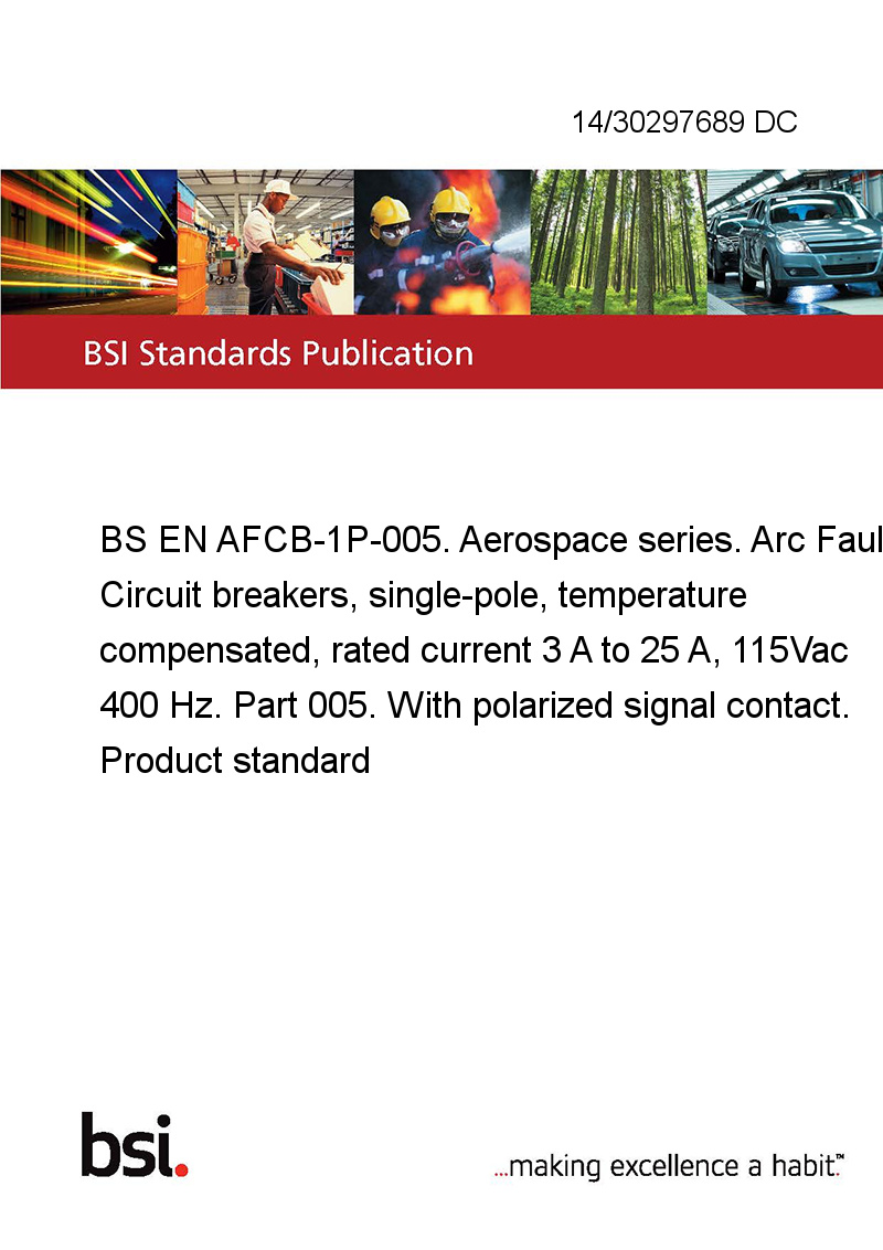 This standard 14/30297689 DC BS EN AFCB-1P-005. Aerospace series. Arc Fault Circuit breakers, single-pole, temperature compensated, rated current 3 A to 25 A, 115Vac 400 Hz. Part 005. With polarized signal contact. Product standard is classified in these ICS categories: