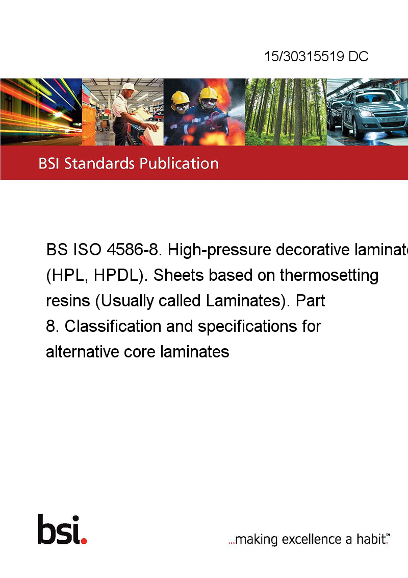 BS ISO 4586-8. High-pressure decorative laminates (HPL, HPDL). Sheets based on thermosetting resins (Usually called Laminates). Part 8. Classification and specifications for alternative core laminates
