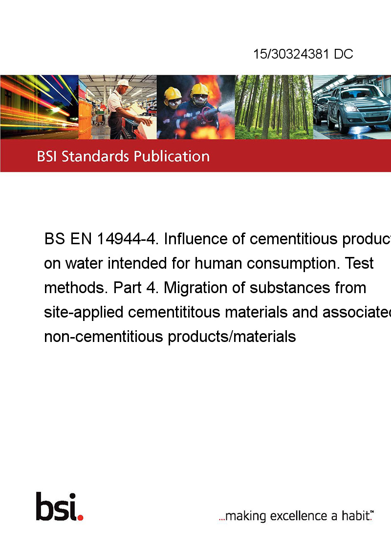 BS EN 14944-4. Influence of cementitious products on water intended for human consumption. Test methods. Part 4. Migration of substances from site-applied cementititous materials and associated non-cementitious products/materials
