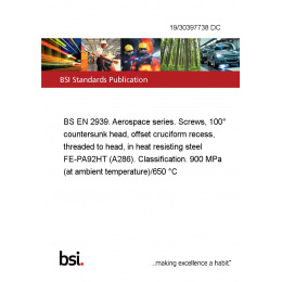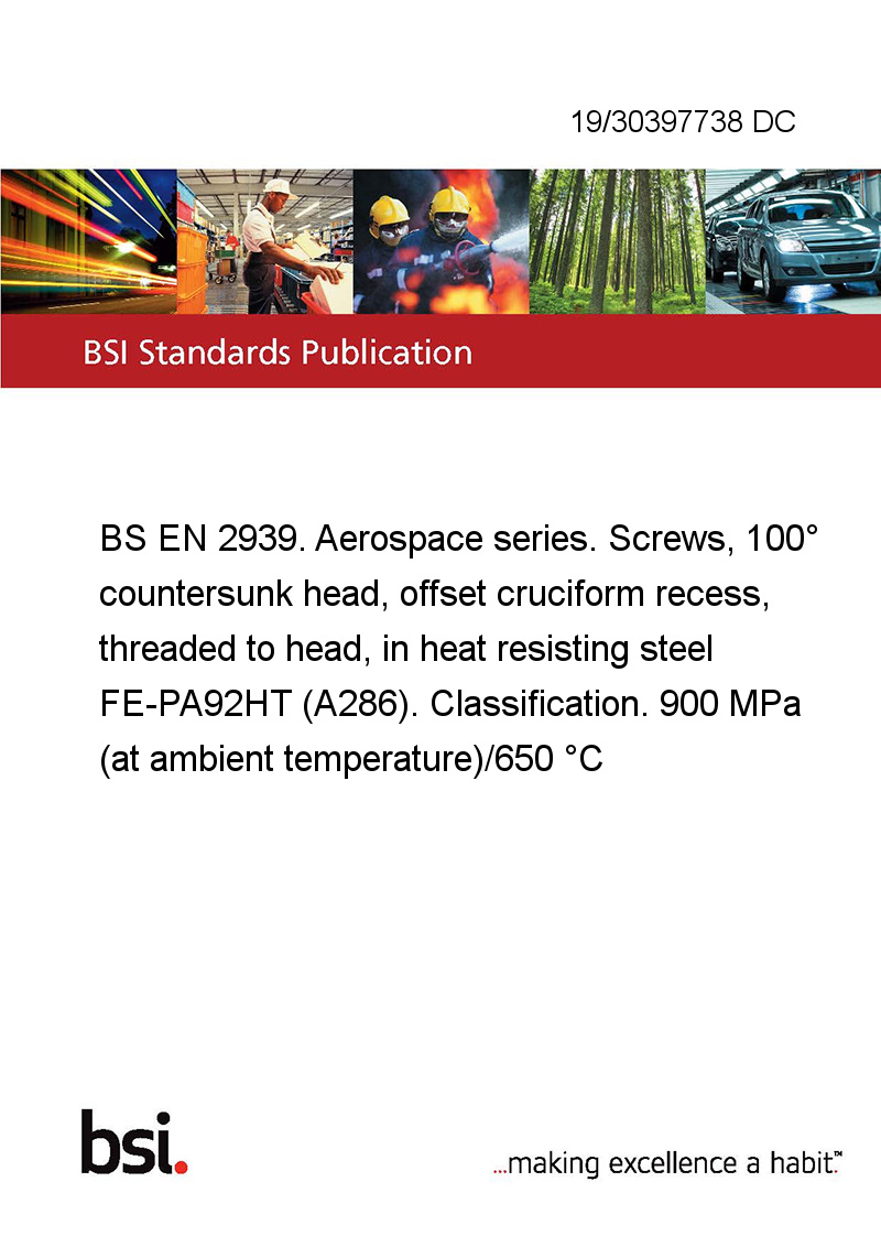 This standard 19/30397738 DC BS EN 2939. Aerospace series. Screws, 100° countersunk head, offset cruciform recess, threaded to head, in heat resisting steel FE-PA92HT (A286). Classification. 900 MPa (at ambient temperature)/650 °C is classified in these ICS categories: