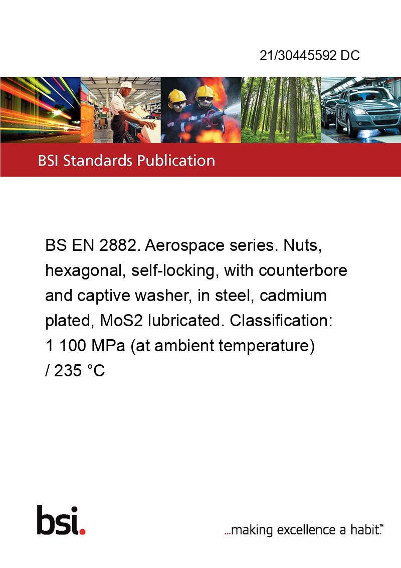 This standard 21/30445592 DC BS EN 2882. Aerospace series. Nuts, hexagonal, self-locking, with counterbore and captive washer, in steel, cadmium plated, MoS2 lubricated. Classification: 1 100 MPa (at ambient temperature) / 235 °C is classified in these ICS categories: