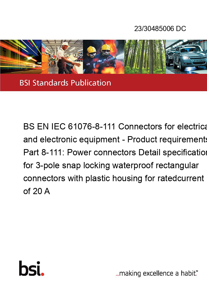 BS EN IEC 61076-8-111 Connectors for electrical and electronic equipment - Product requirements Part 8-111: Power connectors Detail specification for 3-pole snap locking waterproof rectangular connectors with plastic housing for ratedcurrent of 20 A