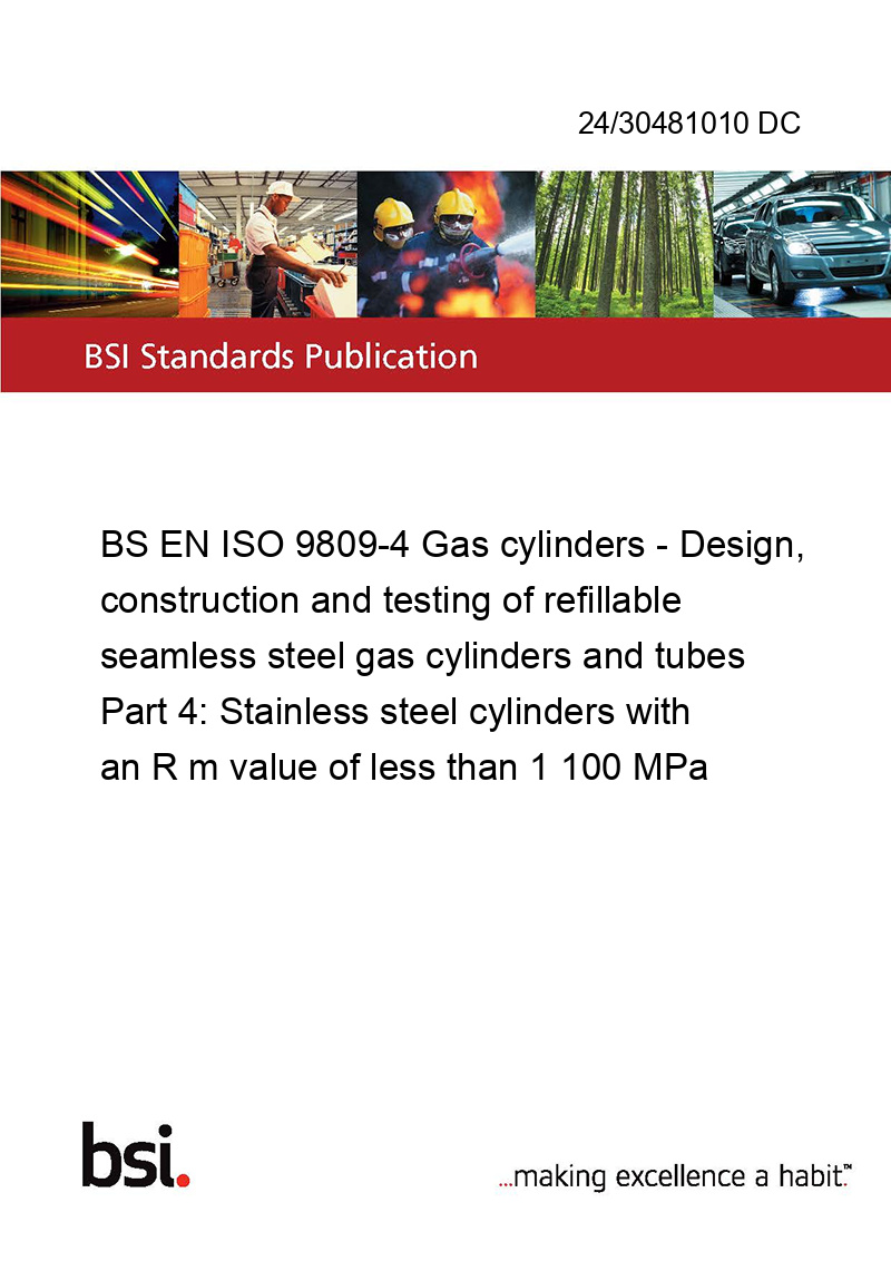BS EN ISO 9809-4 Gas cylinders - Design, construction and testing of refillable seamless steel gas cylinders and tubes Part 4: Stainless steel cylinders with an R m value of less than 1 100 MPa