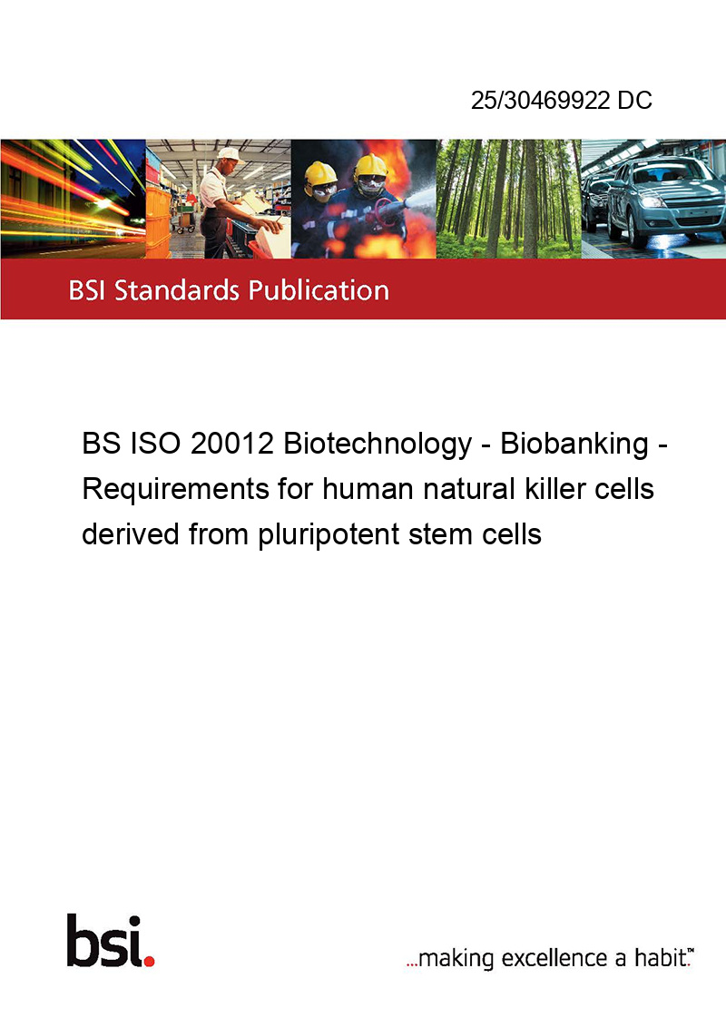 BS ISO 20012 Biotechnology - Biobanking - Requirements for human natural killer cells derived from pluripotent stem cells