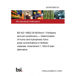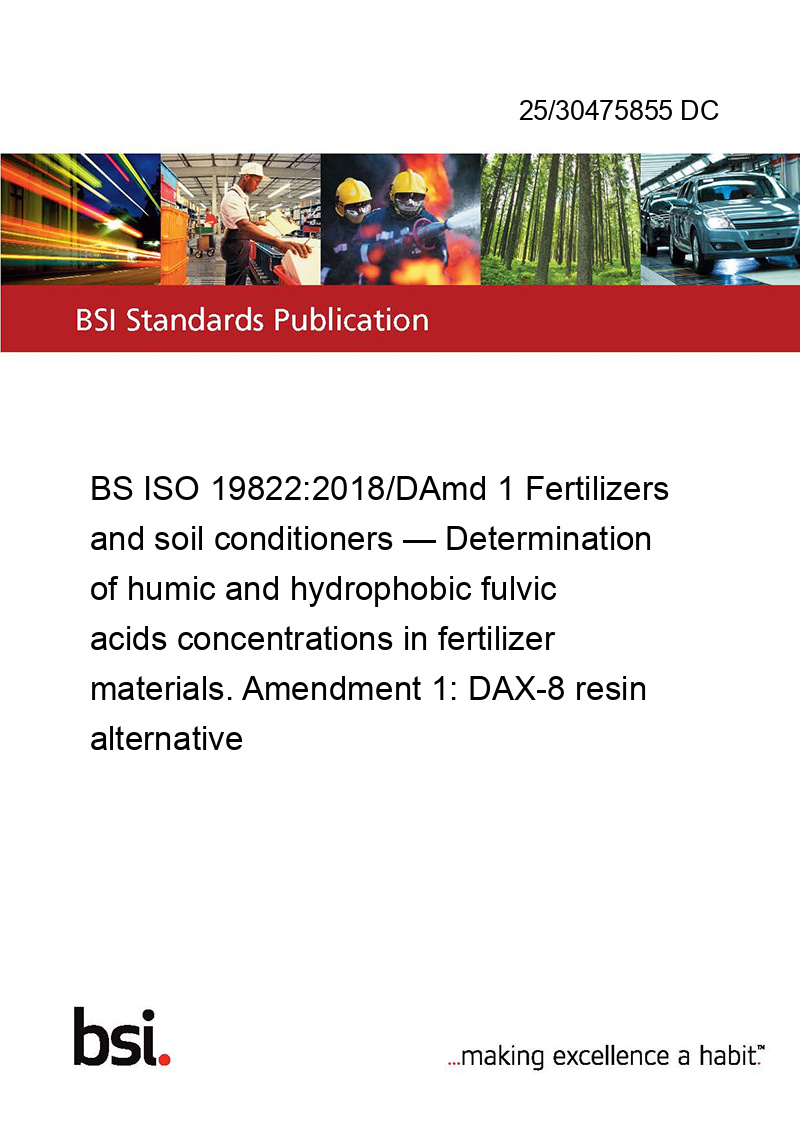BS ISO 19822:2018/DAmd 1 Fertilizers and soil conditioners — Determination of humic and hydrophobic fulvic acids concentrations in fertilizer materials. Amendment 1: DAX-8 resin alternative