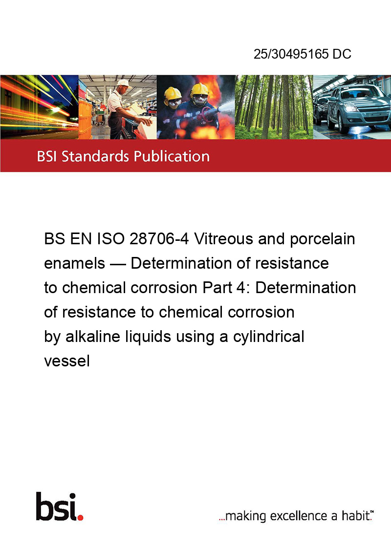 BS EN ISO 28706-4 Vitreous and porcelain enamels — Determination of resistance to chemical corrosion Part 4: Determination of resistance to chemical corrosion by alkaline liquids using a cylindrical vessel