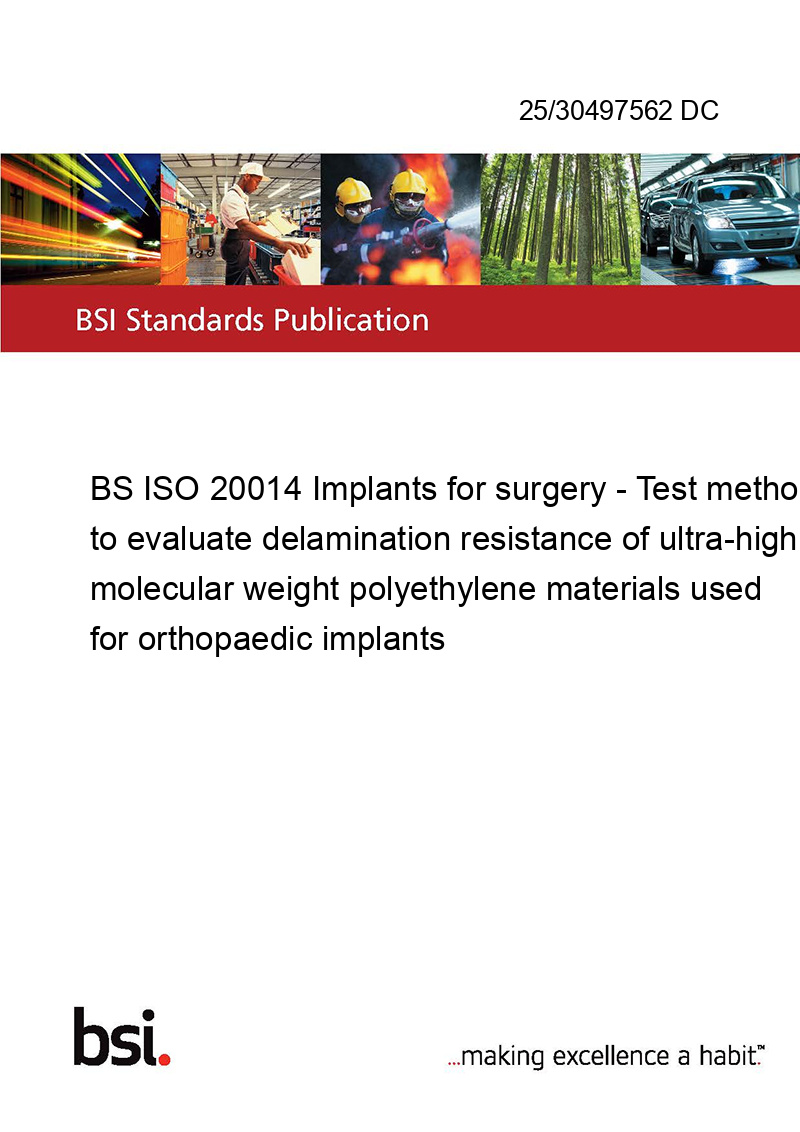 BS ISO 20014 Implants for surgery - Test method to evaluate delamination resistance of ultra-high molecular weight polyethylene materials used for orthopaedic implants