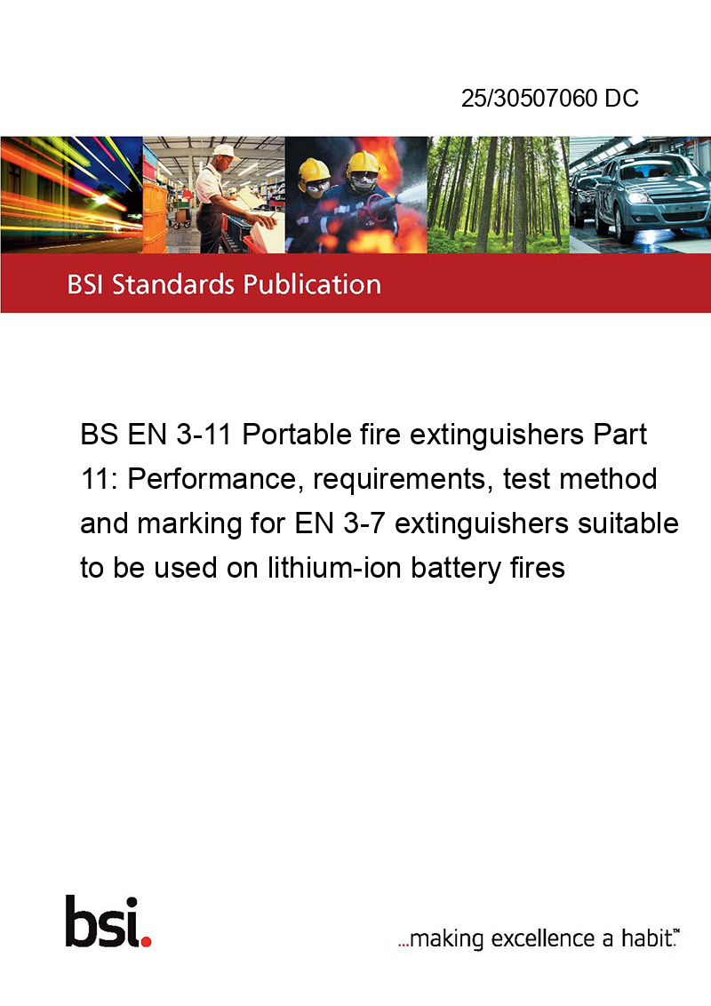 BS EN 3-11 Portable fire extinguishers Part 11: Performance, requirements, test method and marking for EN 3-7 extinguishers suitable to be used on lithium-ion battery fires