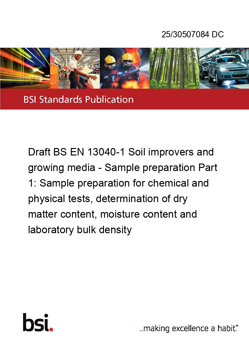 >BSI Standards >65 AGRICULTURE>65.080 Fertilizers>25/30507084 DC Draft BS EN 13040-1 Soil improvers and growing media - Sample preparation Part 1: Sample preparation for chemical and physical tests, determination of dry matter content, moisture content and laboratory bulk density