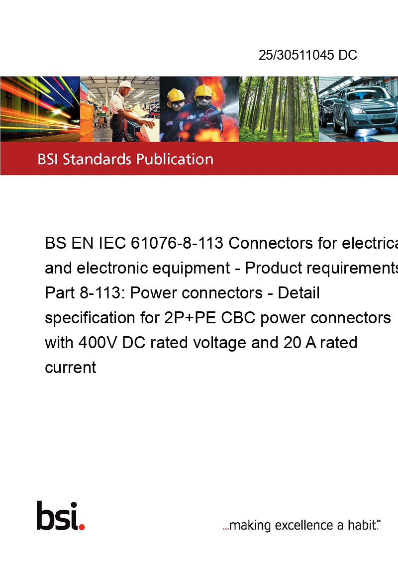BS EN IEC 61076-8-113 Connectors for electrical and electronic equipment - Product requirements Part 8-113: Power connectors - Detail specification for 2P+PE CBC power connectors with 400V DC rated voltage and 20 A rated current