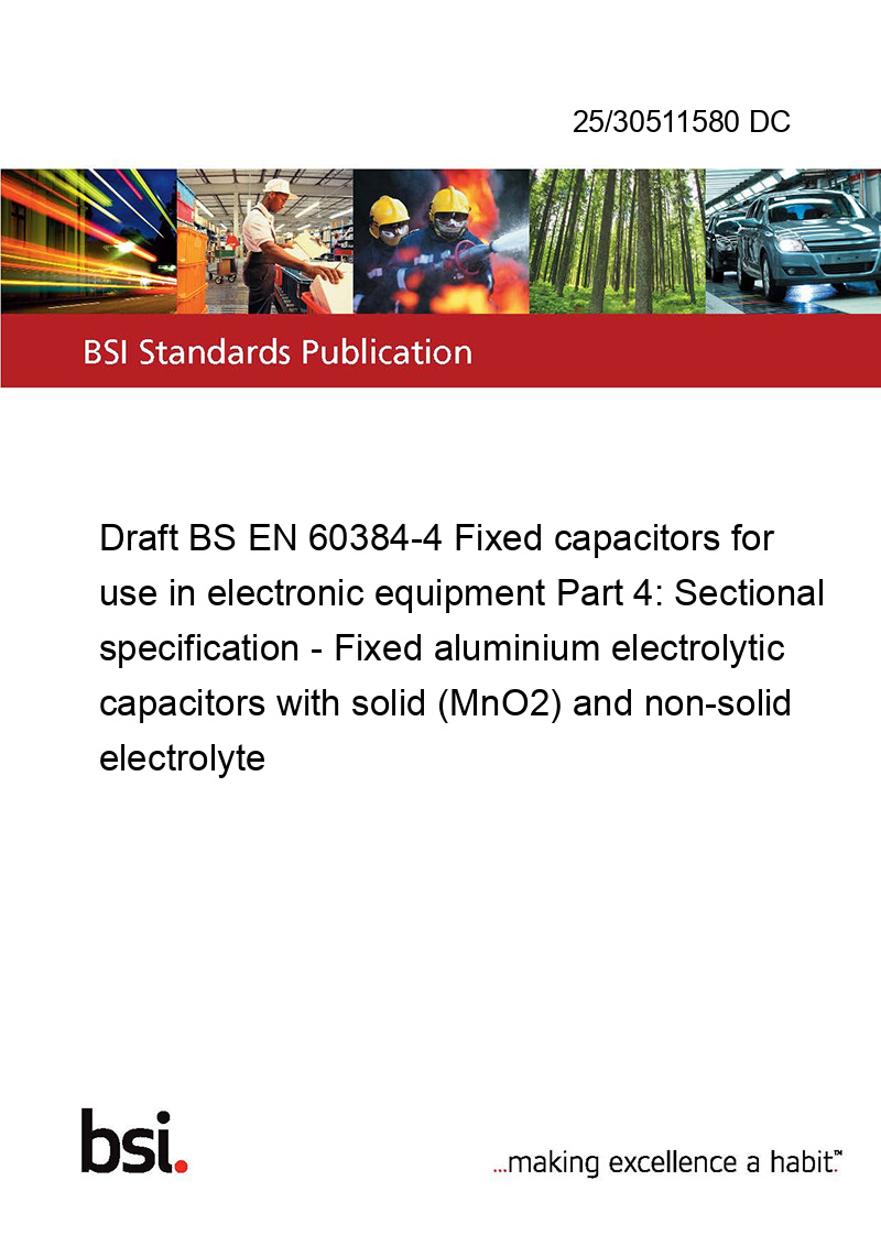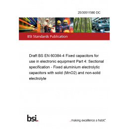 Draft BS EN 60384-4 Fixed capacitors for use in electronic equipment Part 4: Sectional specification - Fixed aluminium electrolytic capacitors with solid (MnO<sub>2</sub>) and non-solid electrolyte