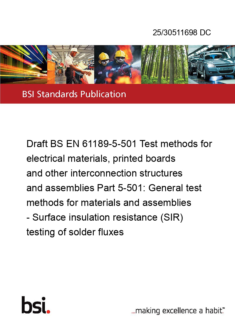 Draft BS EN 61189-5-501 Test methods for electrical materials, printed boards and other interconnection structures and assemblies Part 5-501: General test methods for materials and assemblies - Surface insulation resistance (SIR) testing of solder fluxes