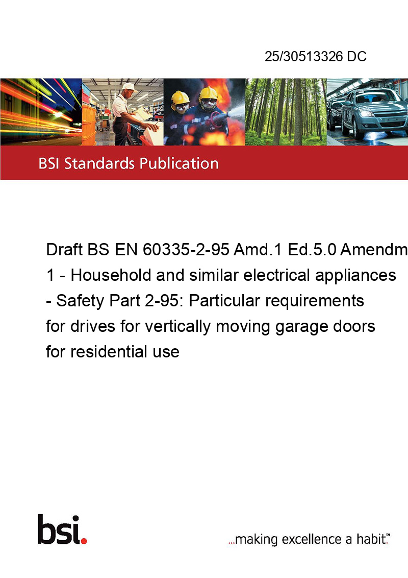 Draft BS EN 60335-2-95 Amd.1 Ed.5.0 Amendment 1 - Household and similar electrical appliances - Safety Part 2-95: Particular requirements for drives for vertically moving garage doors for residential use
