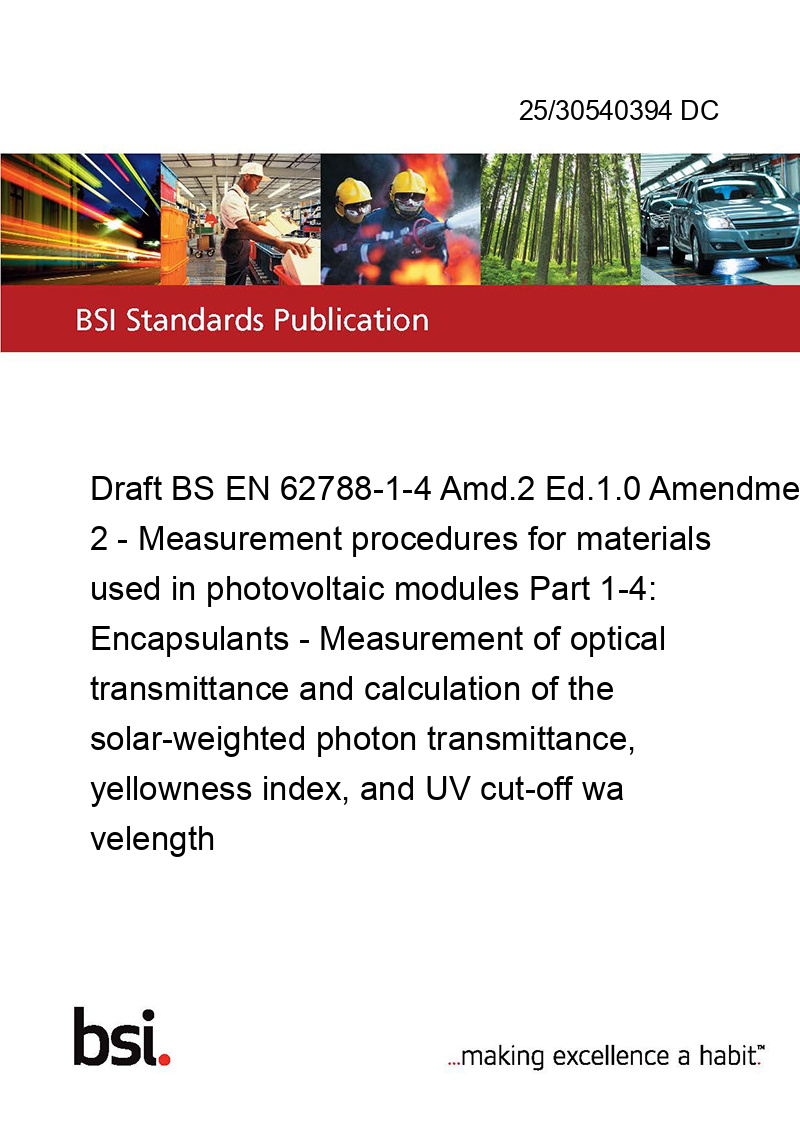 Draft BS EN 62788-1-4 Amd.2 Ed.1.0 Amendment 2 - Measurement procedures for materials used in photovoltaic modules Part 1-4: Encapsulants - Measurement of optical transmittance and calculation of the solar-weighted photon transmittance, yellowness index, and UV cut-off wavelength