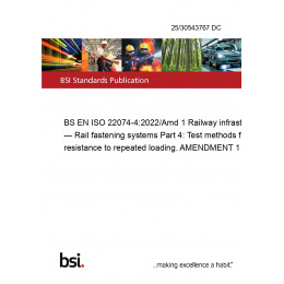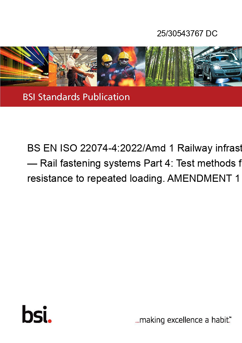 BS EN ISO 22074-4:2022/Amd 1 Railway infrastructure — Rail fastening systems Part 4: Test methods for resistance to repeated loading. AMENDMENT 1