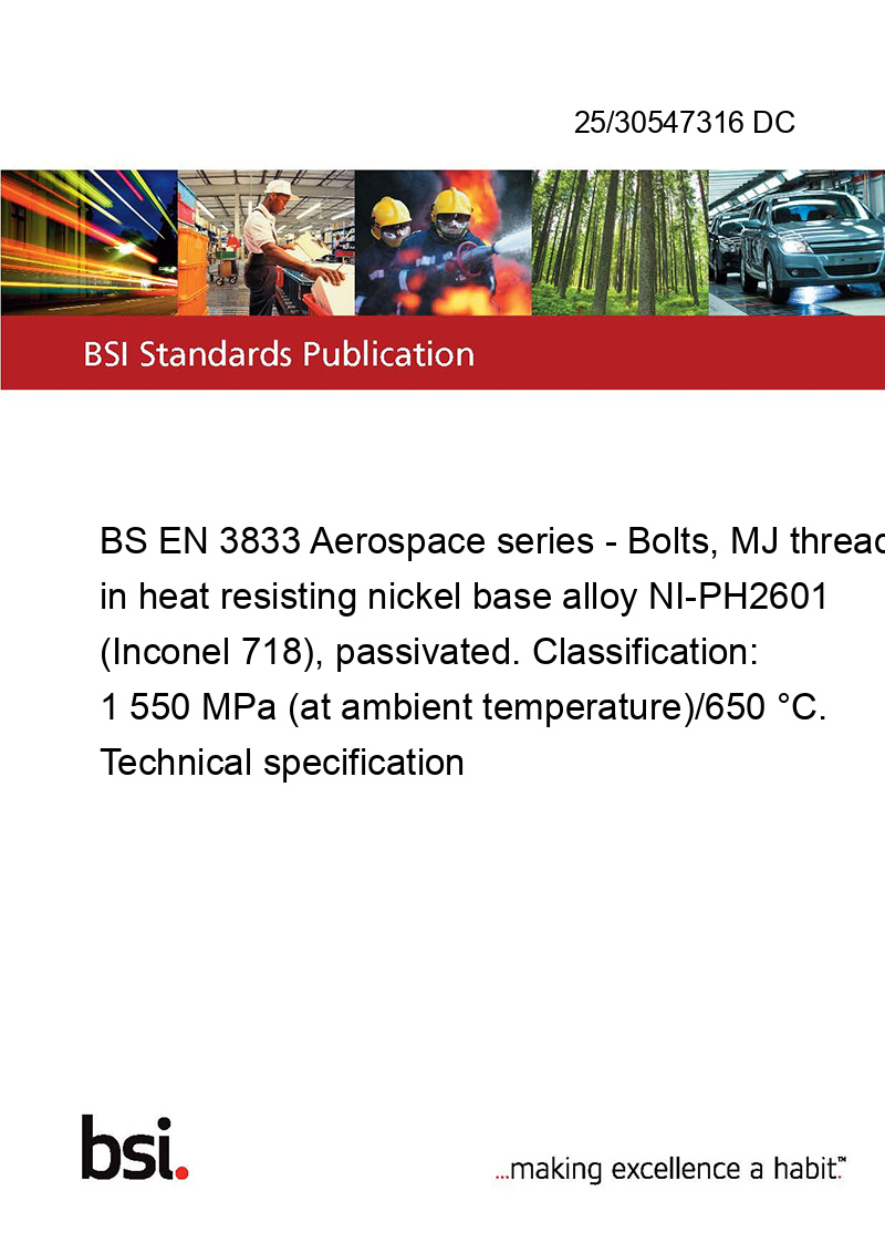 This standard 25/30547316 DC BS EN 3833 Aerospace series - Bolts, MJ threads, in heat resisting nickel base alloy NI-PH2601 (Inconel 718), passivated. Classification: 1 550 MPa (at ambient temperature)/650 °C. Technical specification is classified in these ICS categories: