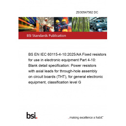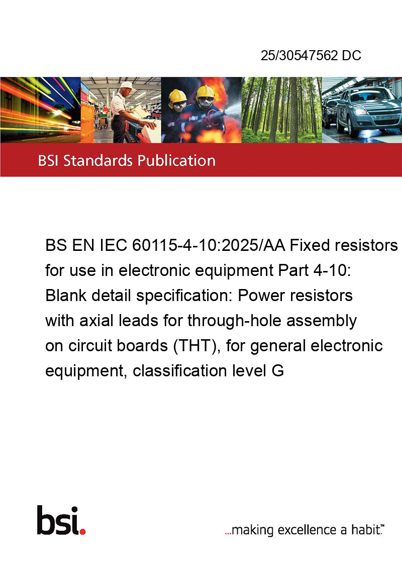 >BSI Standards >31 ELECTRONICS>31.040 Resistors>31.040.10 Fixed resistors>25/30547562 DC BS EN IEC 60115-4-10:2025/AA Fixed resistors for use in electronic equipment Part 4-10: Blank detail specification: Power resistors with axial leads for through-hole assembly on circuit boards (THT), for general electronic equipment, classification level G