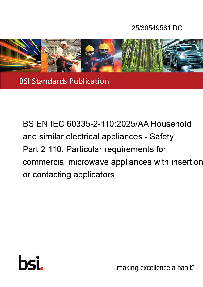 BS EN IEC 60335-2-110:2025/AA Household and similar electrical appliances - Safety Part 2-110: Particular requirements for commercial microwave appliances with insertion or contacting applicators
