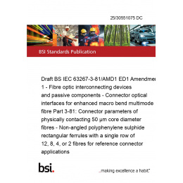Draft BS IEC 63267-3-81/AMD1 ED1 Amendment 1 - Fibre optic interconnecting devices and passive components - Connector optical interfaces for enhanced macro bend multimode fibre Part 3-81: Connector parameters of physically contacting 50 μm core diameter fibres - Non-angled polyphenylene sulphide rectangular ferrules with a single row of 12, 8, 4, or 2 fibres for reference connector applications