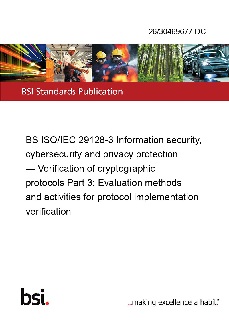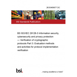 BS ISO/IEC 29128-3 Information security, cybersecurity and privacy protection — Verification of cryptographic protocols Part 3: Evaluation methods and activities for protocol implementation verification