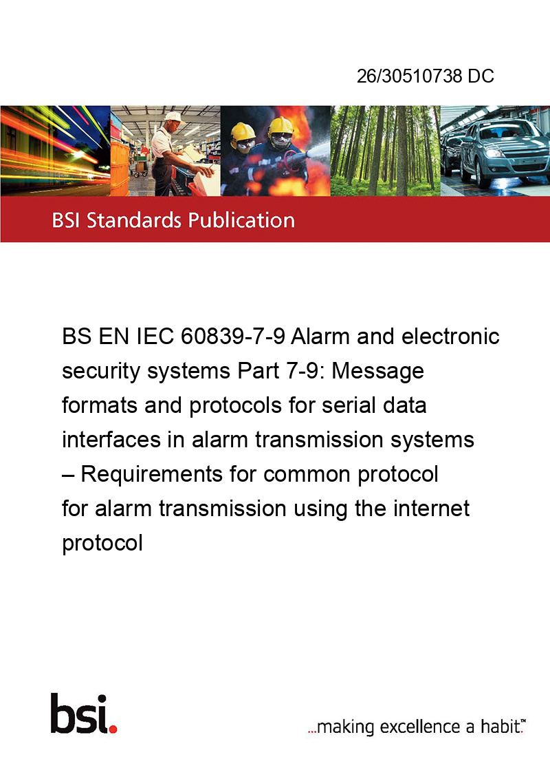 BS EN IEC 60839-7-9 Alarm and electronic security systems Part 7-9: Message formats and protocols for serial data interfaces in alarm transmission systems – Requirements for common protocol for alarm transmission using the internet protocol