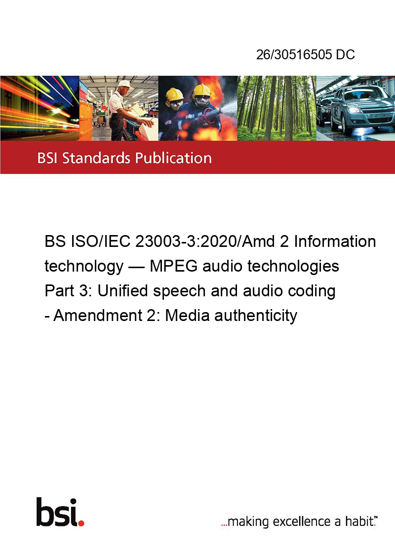 BS ISO/IEC 23003-3:2020/Amd 2 Information technology — MPEG audio technologies Part 3: Unified speech and audio coding - Amendment 2: Media authenticity