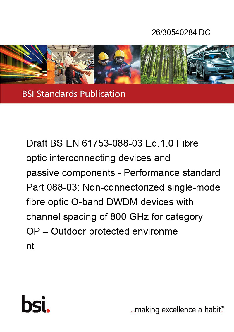 Draft BS EN 61753-088-03 Ed.1.0 Fibre optic interconnecting devices and passive components - Performance standard Part 088-03: Non-connectorized single-mode fibre optic O-band DWDM devices with channel spacing of 800 GHz for category OP – Outdoor protected environment