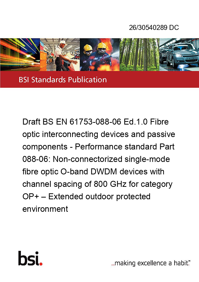 Draft BS EN 61753-088-06 Ed.1.0 Fibre optic interconnecting devices and passive components - Performance standard Part 088-06: Non-connectorized single-mode fibre optic O-band DWDM devices with channel spacing of 800 GHz for category OP+ – Extended outdoor protected environment