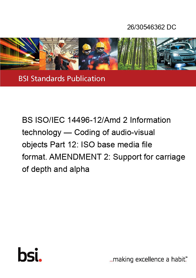 BS ISO/IEC 14496-12/Amd 2 Information technology — Coding of audio-visual objects Part 12: ISO base media file format. AMENDMENT 2: Support for carriage of depth and alpha