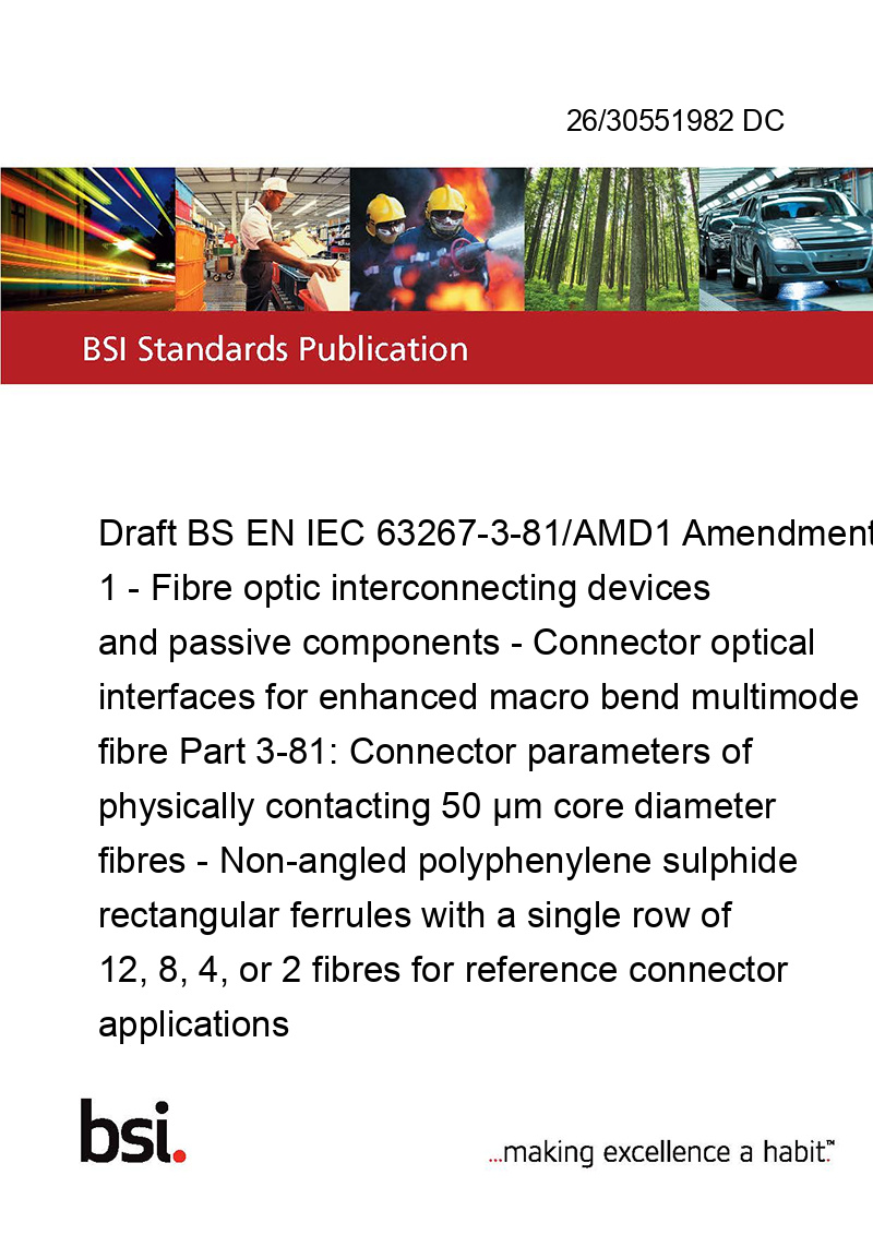 Draft BS EN IEC 63267-3-81/AMD1 Amendment 1 - Fibre optic interconnecting devices and passive components - Connector optical interfaces for enhanced macro bend multimode fibre Part 3-81: Connector parameters of physically contacting 50 μm core diameter fibres - Non-angled polyphenylene sulphide rectangular ferrules with a single row of 12, 8, 4, or 2 fibres for reference connector applications