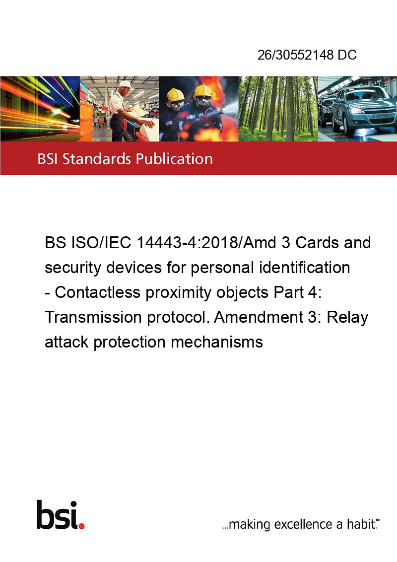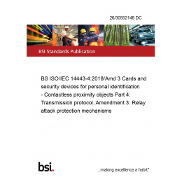 BS ISO/IEC 14443-4:2018/Amd 3 Cards and security devices for personal identification - Contactless proximity objects Part 4: Transmission protocol. Amendment 3: Relay attack protection mechanisms
