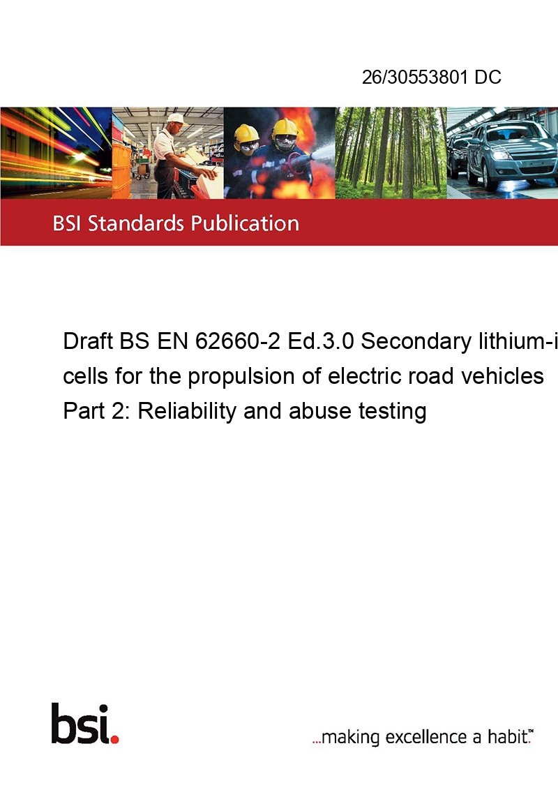 Draft BS EN 62660-2 Ed.3.0 Secondary lithium-ion cells for the propulsion of electric road vehicles Part 2: Reliability and abuse testing