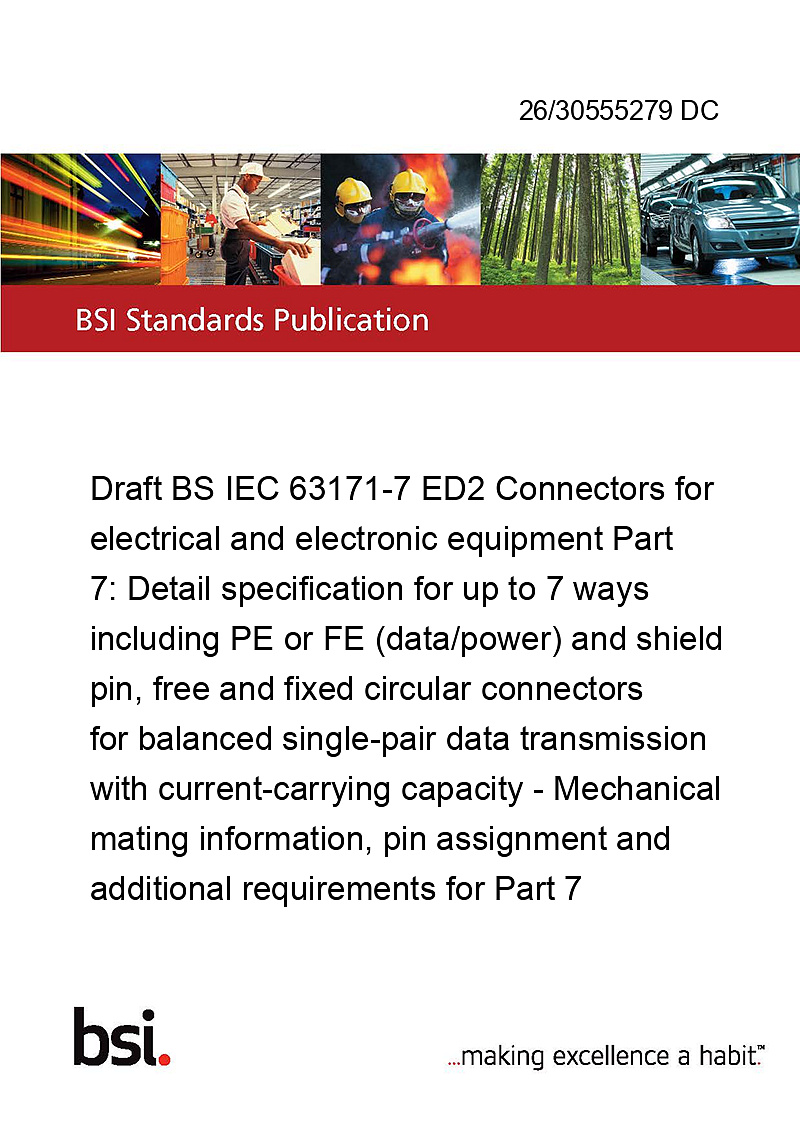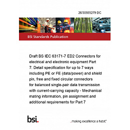 Draft BS IEC 63171-7 ED2 Connectors for electrical and electronic equipment Part 7: Detail specification for up to 7 ways including PE or FE (data/power) and shield pin, free and fixed circular connectors for balanced single-pair data transmission with current-carrying capacity - Mechanical mating information, pin assignment and additional requirements for Part 7