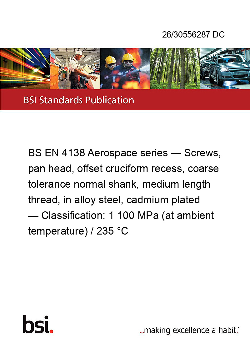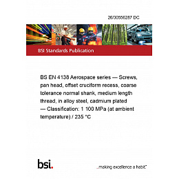 This standard 26/30556287 DC BS EN 4138 Aerospace series — Screws, pan head, offset cruciform recess, coarse tolerance normal shank, medium length thread, in alloy steel, cadmium plated — Classification: 1 100 MPa (at ambient temperature) / 235 °C is classified in these ICS categories: