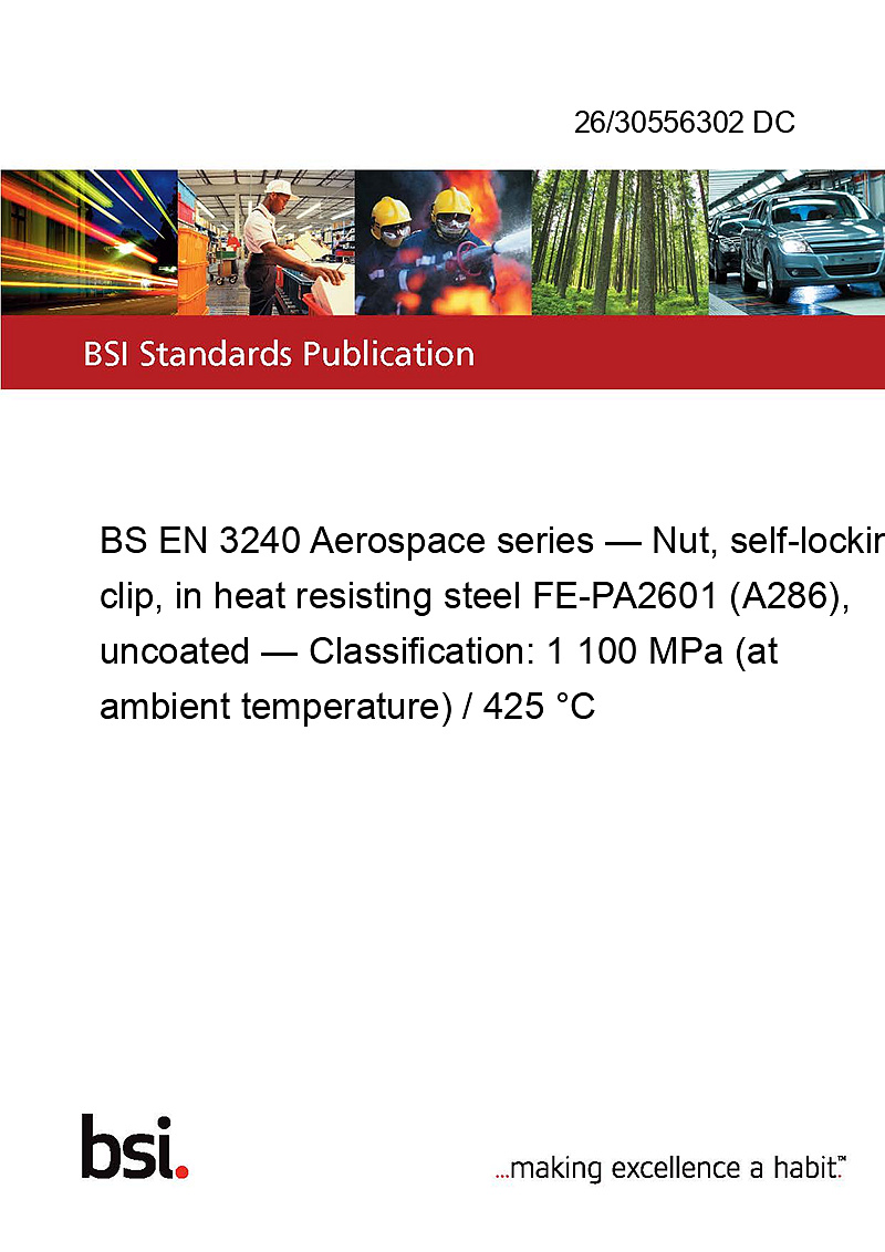 This standard 26/30556302 DC BS EN 3240 Aerospace series — Nut, self-locking, clip, in heat resisting steel FE-PA2601 (A286), uncoated — Classification: 1 100 MPa (at ambient temperature) / 425 °C is classified in these ICS categories: