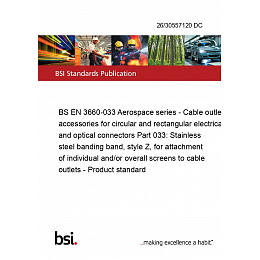 BS EN 3660-033 Aerospace series - Cable outlet accessories for circular and rectangular electrical and optical connectors Part 033: Stainless steel banding band, style Z, for attachment of individual and/or overall screens to cable outlets - Product standard