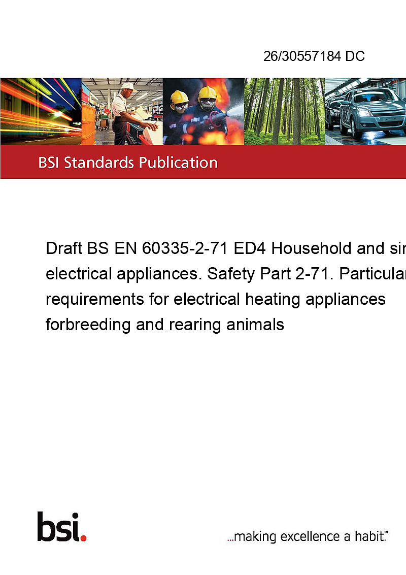 Draft BS EN 60335-2-71 ED4 Household and similar electrical appliances. Safety Part 2-71. Particular requirements for electrical heating appliances forbreeding and rearing animals