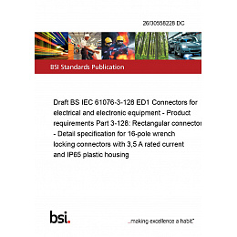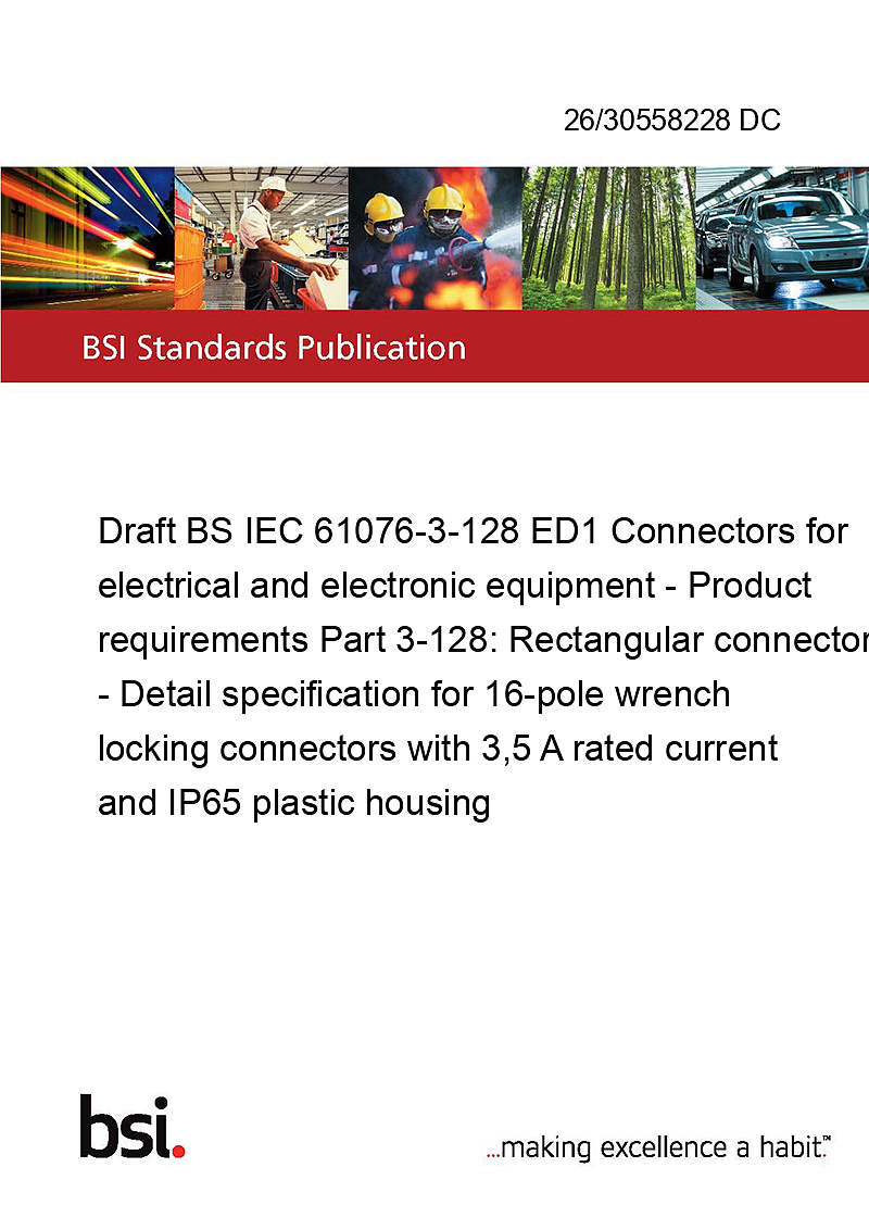 Draft BS IEC 61076-3-128 ED1 Connectors for electrical and electronic equipment - Product requirements Part 3-128: Rectangular connectors - Detail specification for 16-pole wrench locking connectors with 3,5 A rated current and IP65 plastic housing