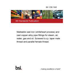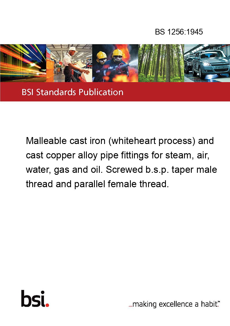 This standard BS 1256:1945 Malleable cast iron (whiteheart process) and cast copper alloy pipe fittings for steam, air, water, gas and oil. Screwed b.s.p. taper male thread and parallel female thread. is classified in these ICS categories: