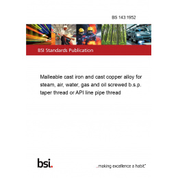 >BSI Standards >23 FLUID SYSTEMS AND COMPONENTS FOR GENERAL USE>23.040 Pipeline components and pipelines>23.040.40 Metal fittings>BS 143:1952 Malleable cast iron and cast copper alloy for steam, air, water, gas and oil screwed b.s.p. taper thread or API line pipe thread