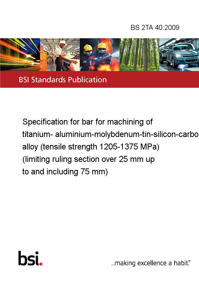 This British Standard specifies requirements for titanium-aluminium-molybdenum-tin-silicon-carbon alloy bar with a tensile strength of 1 205 MPa to 1 375 MPa.