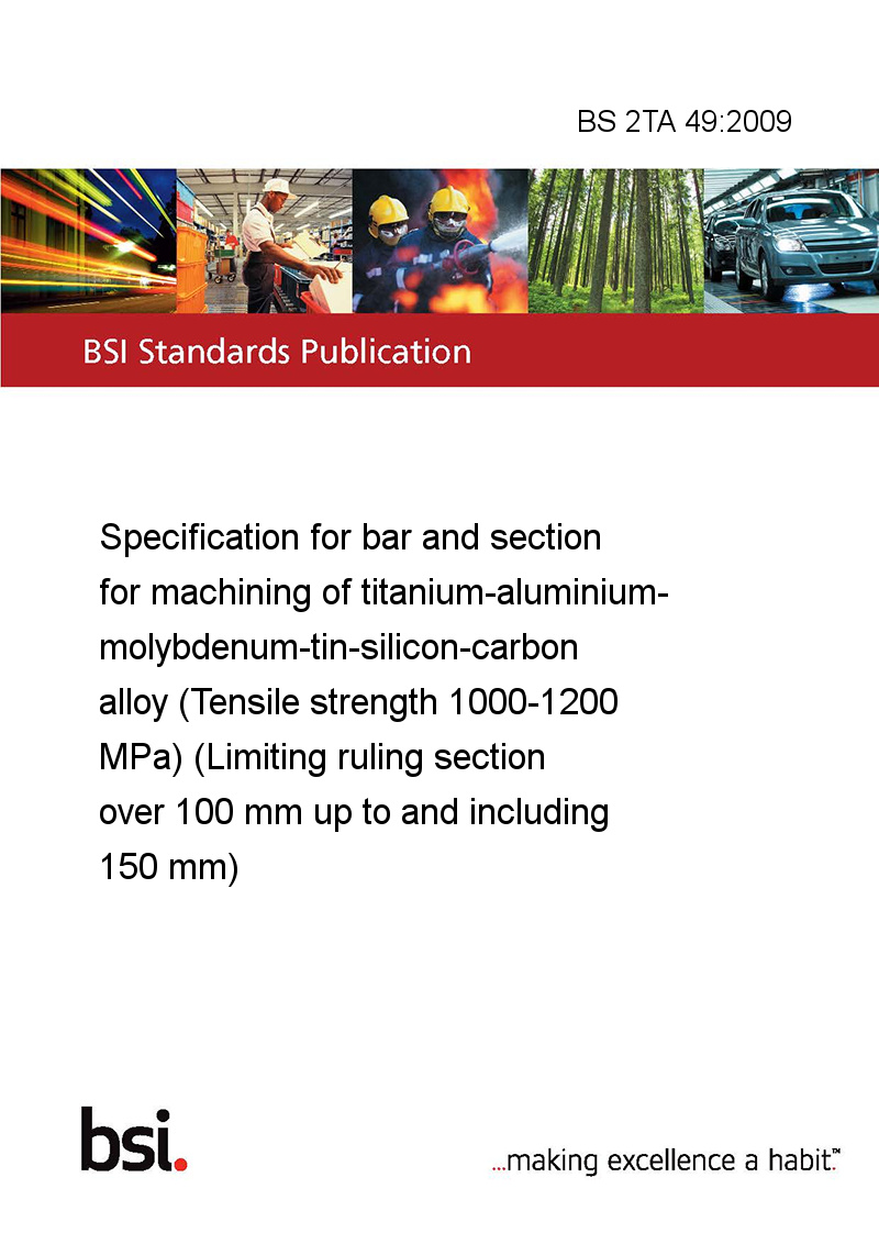 This standard BS 2TA 49:2009 Specification for bar and section for machining of titanium-aluminium- molybdenum-tin-silicon-carbon alloy (Tensile strength 1000-1200 MPa) (Limiting ruling section over 100 mm up to and including 150 mm) is classified in these ICS categories:
