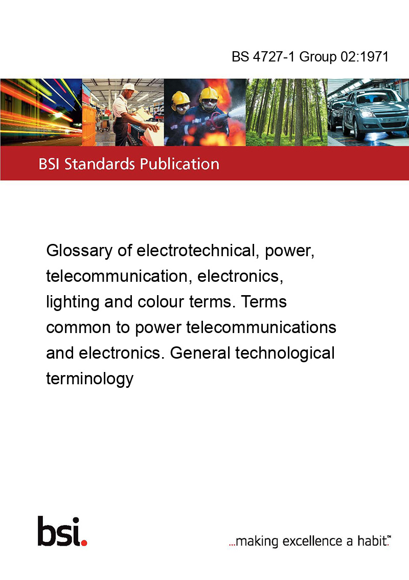 This standard BS 4727-1 Group 02:1971 Glossary of electrotechnical, power, telecommunication, electronics, lighting and colour terms. Terms common to power telecommunications and electronics. General technological terminology is classified in these ICS categories: