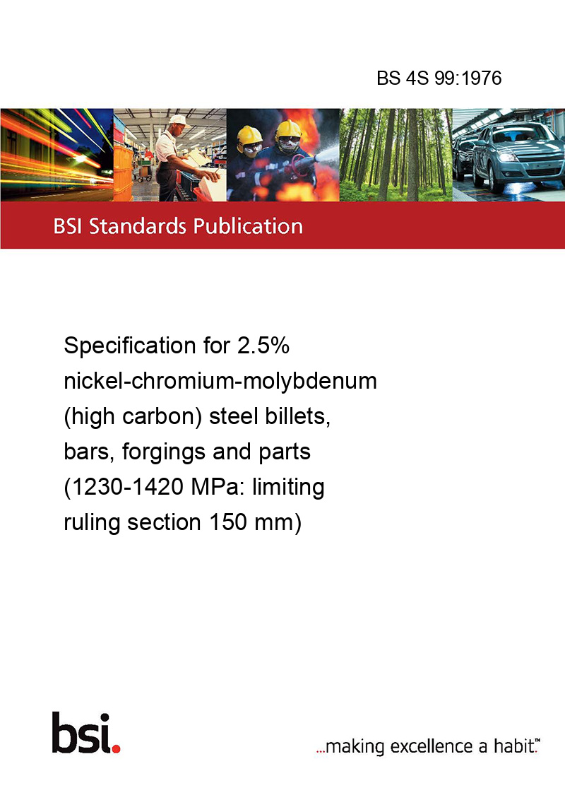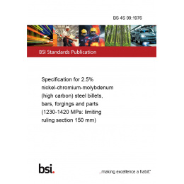 This standard BS 4S 99:1976 Specification for 2.5% nickel-chromium-molybdenum (high carbon) steel billets, bars, forgings and parts (1230-1420 MPa: limiting ruling section 150 mm) is classified in these ICS categories: