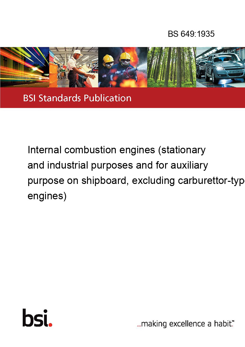 This standard BS 649:1935 Internal combustion engines (stationary and industrial purposes and for auxiliary purpose on shipboard, excluding carburettor-type engines) is classified in these ICS categories: