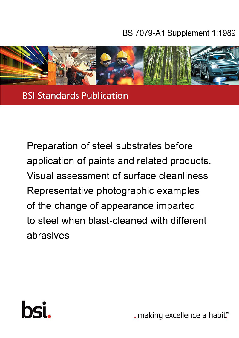 BS 7079-A1 Supplement 1:1989 Preparation of steel substrates before application of paints and related products. Visual assessment of surface cleanliness Representative photographic examples of the change of appearance imparted to steel when blast-cleaned with different abrasives