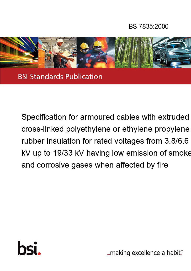This standard BS 7835:2000 Specification for armoured cables with extruded cross-linked polyethylene or ethylene propylene rubber insulation for rated voltages from 3.8/6.6 kV up to 19/33 kV having low emission of smoke and corrosive gases when affected by fire is classified in these ICS categories: