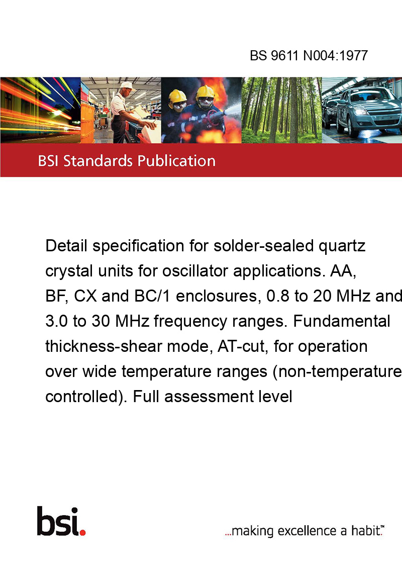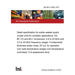 This standard BS 9611 N004:1977 Detail specification for solder-sealed quartz crystal units for oscillator applications. AA, BF, CX and BC/1 enclosures, 0.8 to 20 MHz and 3.0 to 30 MHz frequency ranges. Fundamental thickness-shear mode, AT-cut, for operation over wide temperature ranges (non-temperature controlled). Full assessment level is classified in these ICS categories: