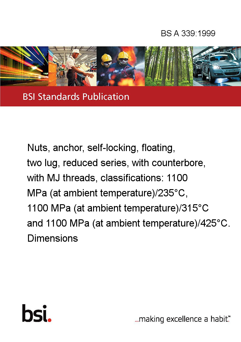 This standard BS A 339:1999 Nuts, anchor, self-locking, floating, two lug, reduced series, with counterbore, with MJ threads, classifications: 1100 MPa (at ambient temperature)/235°C, 1100 MPa (at ambient temperature)/315°C and 1100 MPa (at ambient temperature)/425°C. Dimensions is classified in these ICS categories: