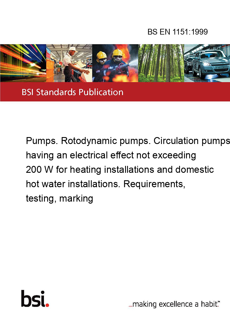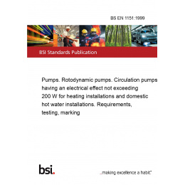 This standard BS EN 1151:1999 Pumps. Rotodynamic pumps. Circulation pumps having an electrical effect not exceeding 200 W for heating installations and domestic hot water installations. Requirements, testing, marking is classified in these ICS categories: